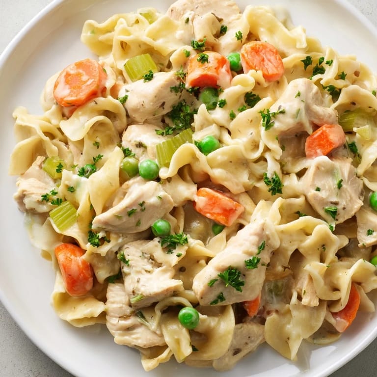 Pin It There's something about a bowl of creamy chicken and noodles that transports you straight back to your grandmother's kitchen, even if you're cooking it yourself for the first time. One rainy Tuesday evening, I was standing in front of an almost-bare pantry, feeling uninspired, when I spotted a bag of egg noodles and remembered this dish my mom used to make—simple, warm, and somehow always perfect. I decided to recreate it from vague memory, tossing in whatever vegetables I had on hand, and the result was so comforting that I immediately wrote down what I'd done before I forgot. Now it's become my go-to when I need dinner that feels like a hug, ready in under an hour.