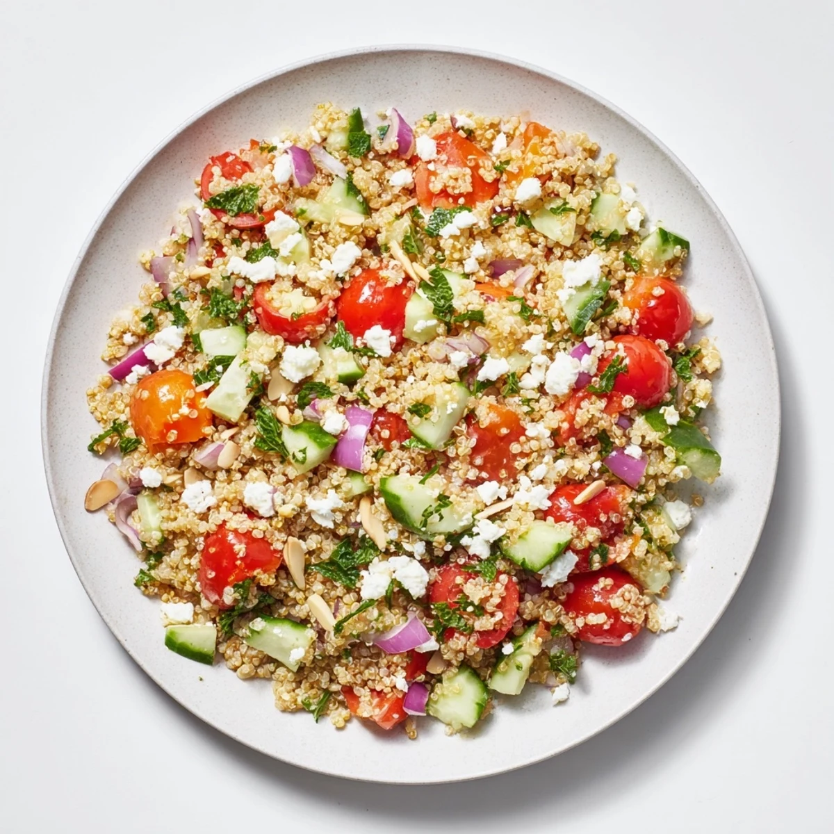 Pin It This quinoa salad is a celebration of texture and taste—from the tender yet fluffy quinoa to the crunchy bite of fresh cucumbers and bell peppers. Infused with a tangy lemon vinaigrette, every forkful bursts with zest and vitality. The optional fresh mint adds a refreshing herbal note, making this salad truly exceptional.