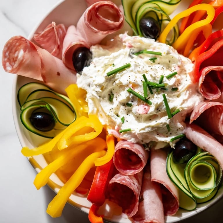You can absolutely prepare this platter 3-4 hours before guests arrive, which means one less thing to worry about when people show up. The one rule is to keep it covered with plastic wrap in the fridge so the dip doesn't dry out and the vegetable curls don't start browning. If you're worried about things getting soggy, do one smart trick: arrange everything except the delicate pepper curls an hour ahead, then add those final spirals just before people arrive, because peppers are the first casualty of time.