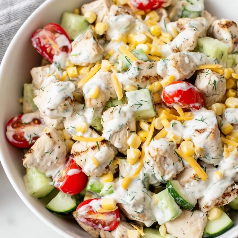 - In a large bowl, combine the lettuce, chicken, corn, tomatoes, cucumber, red onion, cheddar, and chives, creating a colorful mosaic that looks as good as it tastes