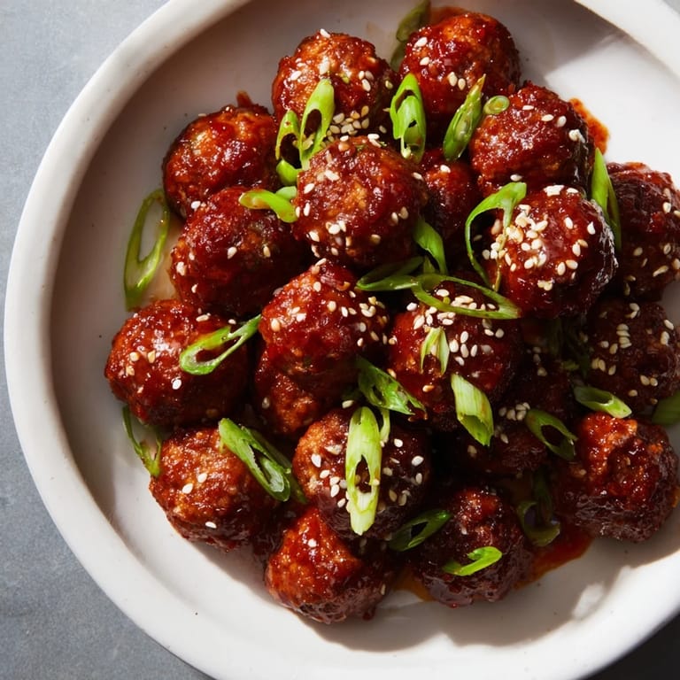Pin It Juicy meatballs glazed with a sweet and spicy sriracha-honey sauce, perfect as crowd-pleasing appetizers or party bites.