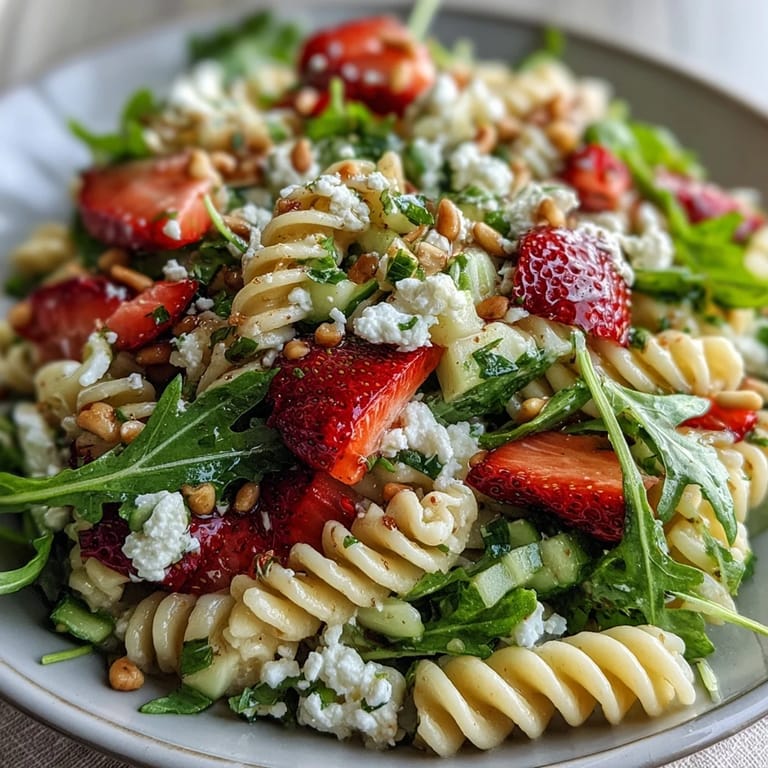 Pin It Celebrate the freshness of spring with this vibrant pasta salad, where sweet strawberries, tangy feta, and peppery arugula come together in perfect harmony. Inspired by Mediterranean flavors, this dish is a joyful combination of color and taste—ideal for lively gatherings, picnics, or an easy light lunch in the sunshine. Every bite sings with brightness and a touch of sophistication, making it a standout on any table.